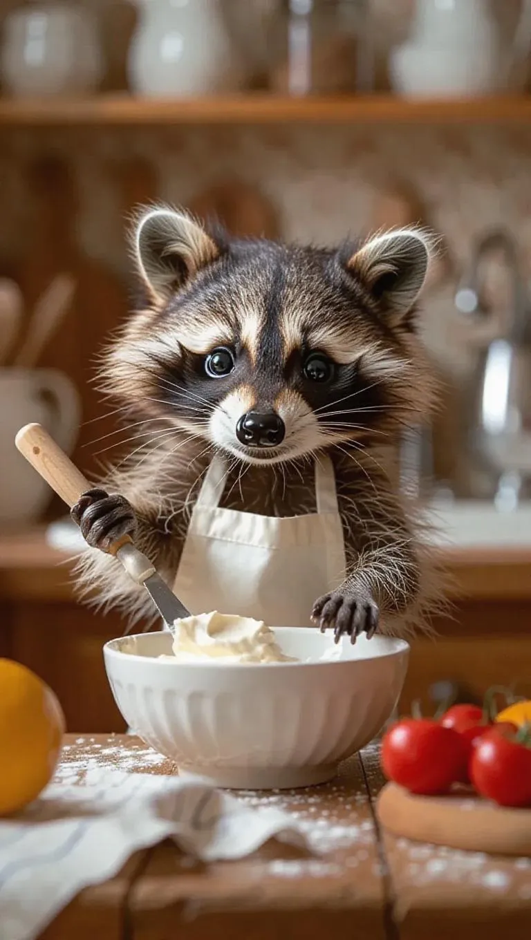 The small baby raccoon, adorned with its distinctive fur and bushy tail, clothed in a tiny apron, is in a cheerful kitchen. It eagerly mixes a white bowl of pancake batter with a mixing spoon, surrounded by fresh fruit. The raccoon's motions are fast and playful, its tail bouncing as it creates. The image captures the raccoon's joy and warmth, centering on its animated face and the delightful environment.