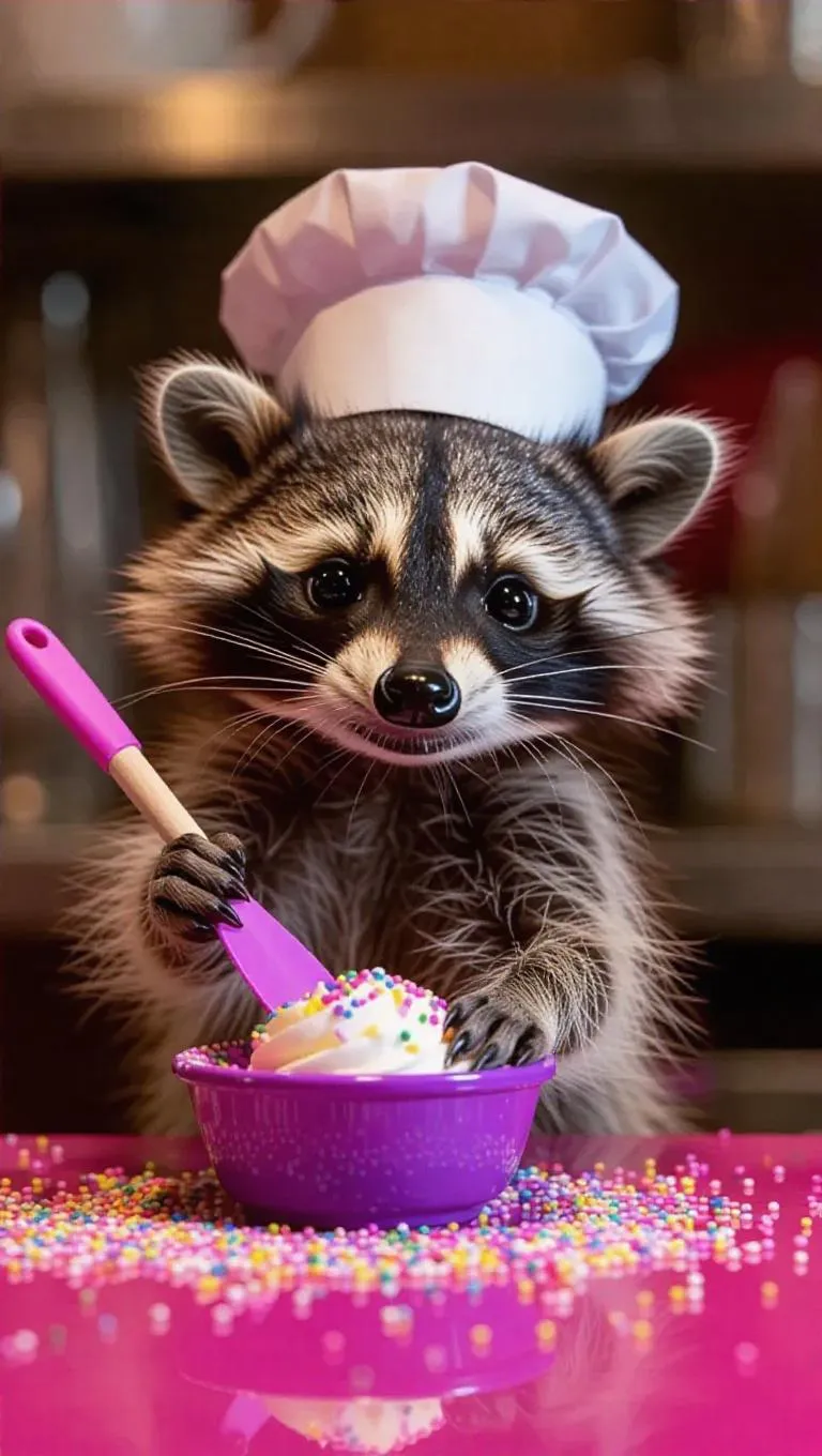 The adorable baby raccoon, characterized by its striped coat and large tail, sporting a small chef's hat, is in a bright cafe. It diligently folds a purple bowl of frosting with a rubber spatula, encircled by colorful sprinkles. The raccoon's movements are quick and spirited, its tail fluttering as it works. The camera focuses on the raccoon's excitement and satisfaction, highlighting its expressive features and the lively backdrop.
