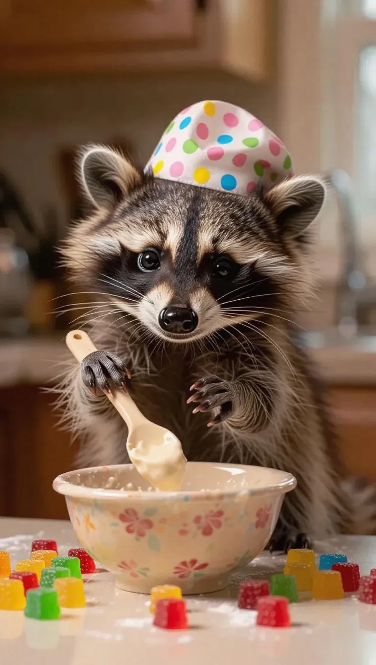 The cute baby raccoon, displaying its delightful stripes and bushy tail, wearing a tiny hat, is in an artistically decorated kitchen. It passionately beats a cream-colored bowl of gumdrop dough with a spatula, surrounded by gummy candies. The raccoon's actions are lively and enthusiastic, its tail flicking back and forth. The shot captures the raccoon's joy and creativity, centering on its expressive face and the cheerful environment.