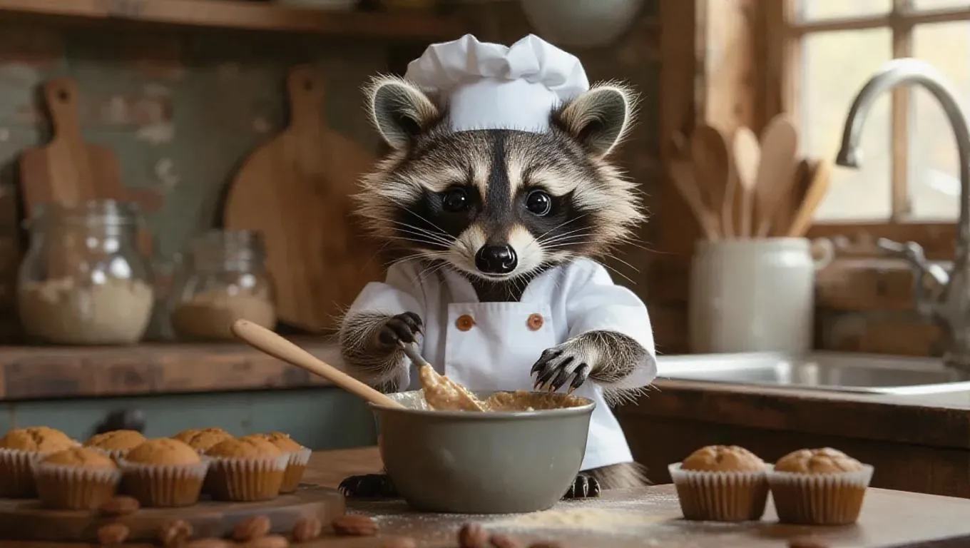The petite baby raccoon, characterized by its mesmerizing fur and plush tail, dressed in a little chef's coat, is in a rustic kitchen. It attentively mixes a gray bowl of muffin batter with a wooden spoon, surrounded by dried fruits. The raccoon's motions are swift and spirited, its tail playfully moving as it bakes. The camera catches the raccoon's happiness and comfort, focusing on its lively expressions and the inviting surroundings.