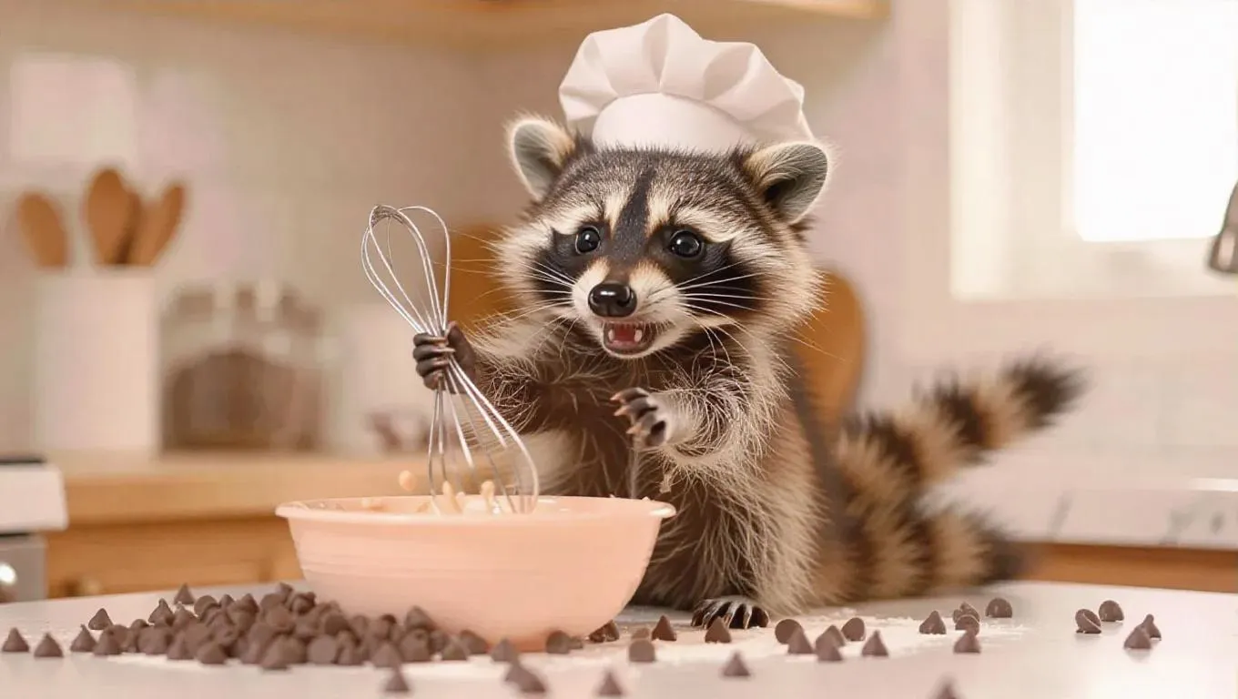 The tiny baby raccoon, known for its striped fur and fluffy tail, donning a little baker's hat, is in an airy kitchen. It excitedly whisks a peach-colored bowl of batter with a rubber whisk, surrounded by chocolate chips. The raccoon's movements are quick and animated, its tail whipping around as it mixes. The camera captures the raccoon's glee and joyfulness, centering on its happy face and the whimsical environment.