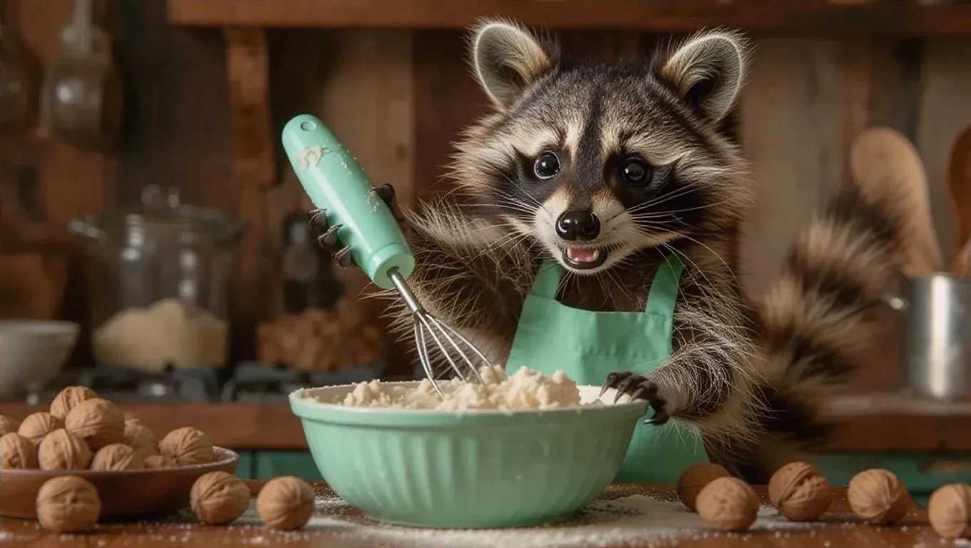 The cute baby raccoon, characterized by its unique fur pattern and bushy tail, clad in a bright cooking outfit, is in a rustic kitchen. It enthusiastically beats a mint green bowl of cookie dough with a hand blender, surrounded by walnuts. The raccoon's movements are quick and spirited, its tail moving with excitement. The camera highlights the raccoon's exhilaration and energy, showcasing its happy face and the charming decor.