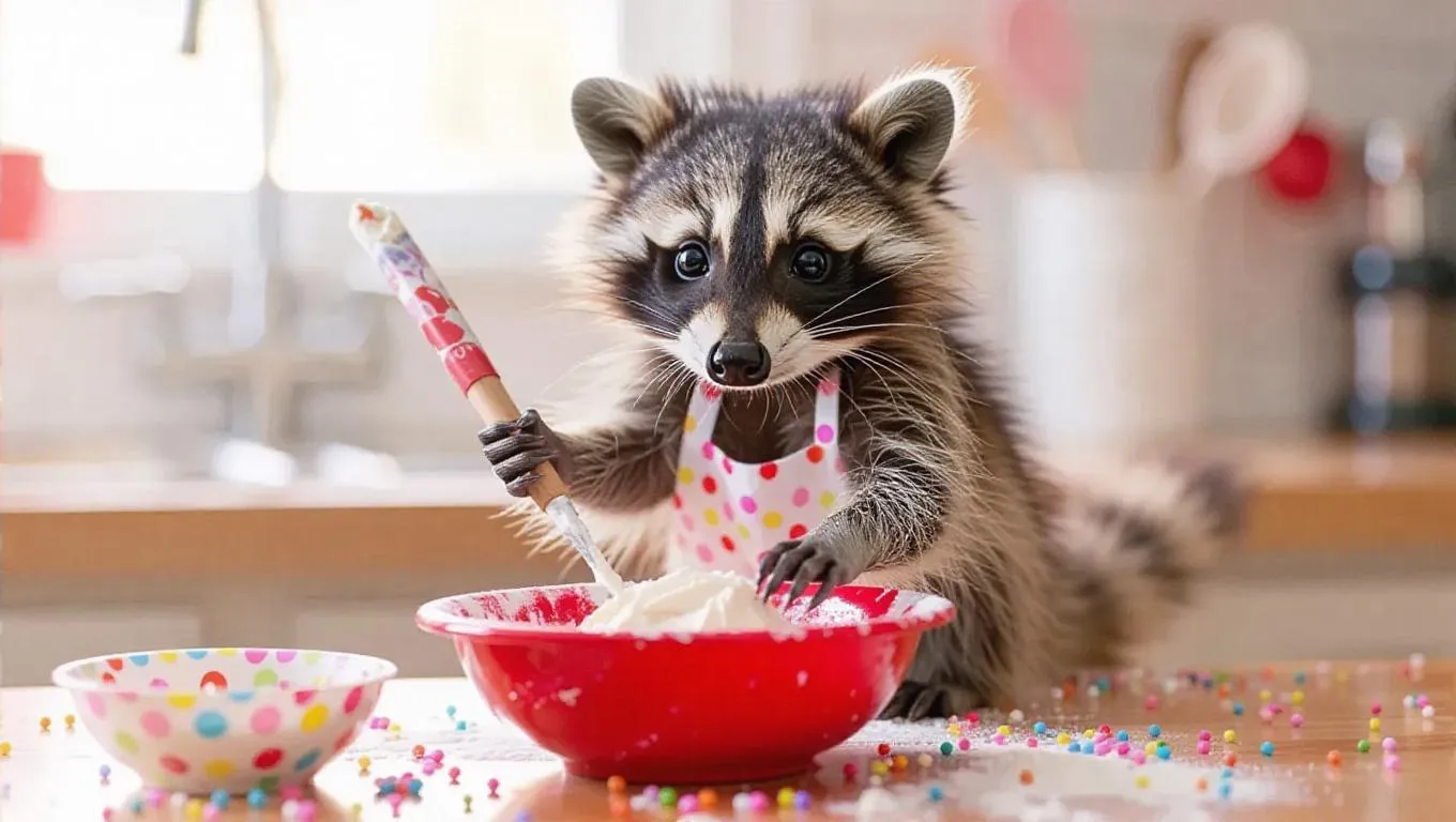 The petite baby raccoon, identified by its playful stripes and soft tail, wearing a cheerful baker outfit, is in a sunny little kitchen. It diligently folds a bright red bowl of batter with a flexible spatula, surrounded by sprinkles. The raccoon's motions are fast and enthusiastic, its tail wagging as it prepares. The image showcases the raccoon's excitement and creativity, emphasizing its lively face and the inviting surroundings.