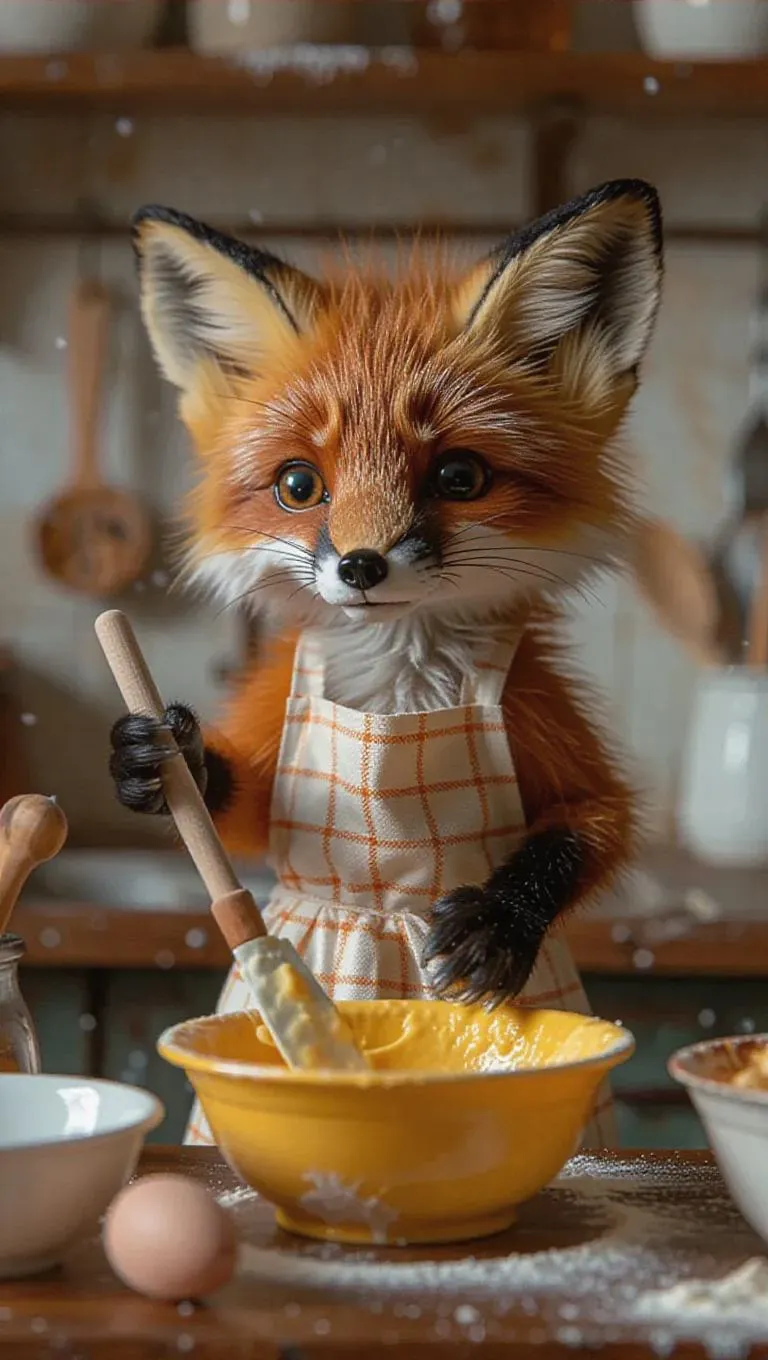 The miniature baby fox, with its orange fur and tufted tail, wearing a tiny apron, stirs a yellow bowl of batter with a rubber spatula in a vintage kitchen. Surrounded by baking tools, the fox is completely absorbed in its task, radiating cheerfulness and determination. The camera captures the fox’s joyous expressions as it mixes.