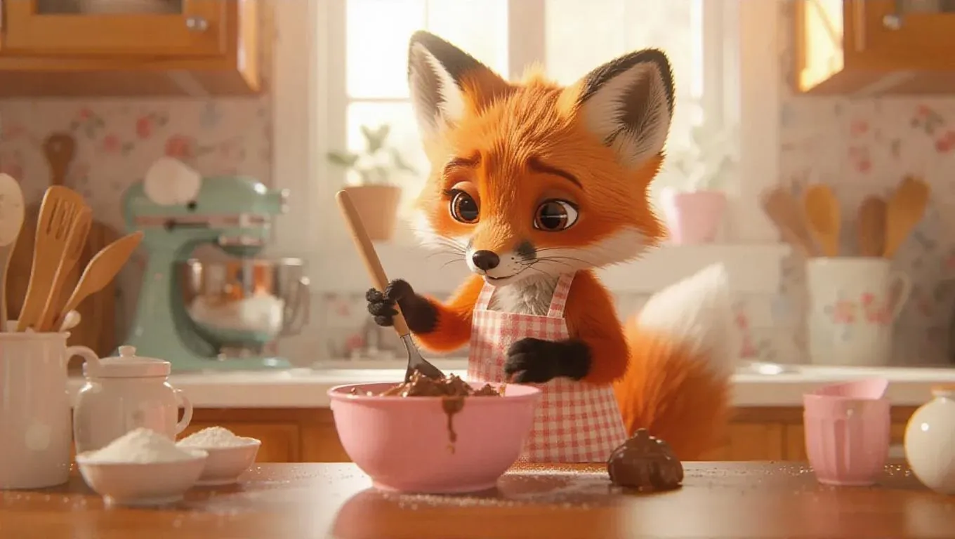 The miniature baby fox, with its orange fur and tufted tail, wearing a tiny apron, stirs a pink bowl of brownie mix with a ceramic spoon in a cozy kitchen. Surrounded by baking tools, the fox is completely immersed in its task, radiating enthusiasm and dedication. The camera gracefully focuses on the mix being whipped.