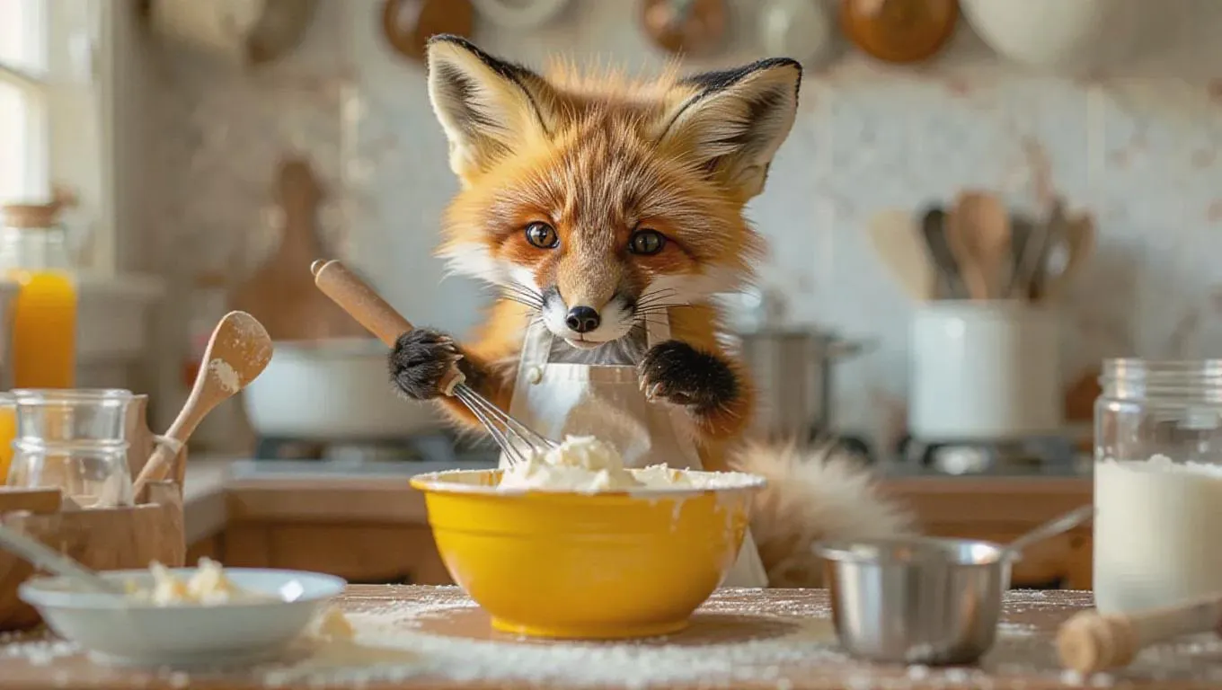 The miniature baby fox, with its orange fur and tufted tail, wearing a small apron, stirs a yellow bowl of cake batter with a metal whisk in a retro kitchen. Surrounded by cooking tools, the fox is engaged in its task, radiating determination and focus. The camera captures the stirring action close-up.