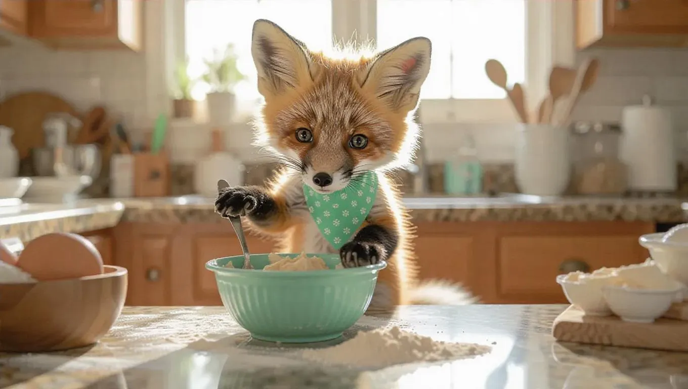 The miniature baby fox, with its orange fur and fluffy tail, wearing a tiny bandana, stirs a mint green bowl of cookie dough with a stainless steel spoon in a sunny kitchen. Surrounded by baking items, the fox is completely absorbed in its task, radiating enthusiasm and joy. The camera smoothly follows its stirring motion.