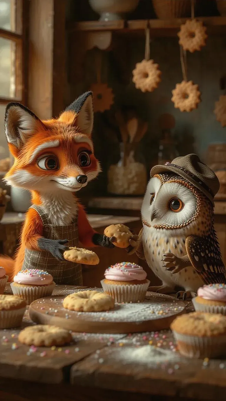 A whimsical bakery scene featuring a fox, hedgehog, and owl baking together. The fox expertly rolls out dough for pies, the hedgehog meticulously measures flour, and the owl decorates cupcakes with intricate designs. Vintage wooden tables, vibrant sprinkles, and charming baker’s caps. Warm, inviting atmosphere with playful details like a cookie stuck to the ceiling and the owl sneaking a taste. Animals exude joy and focus