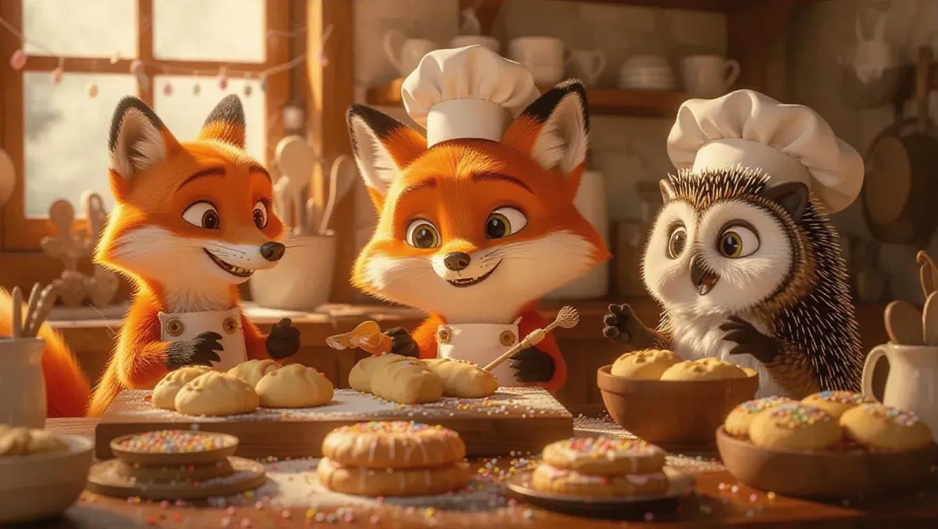 A whimsical bakery scene featuring a fox, hedgehog, and owl baking together. The fox rolls out dough for danishes, the hedgehog glances at a recipe book, and the owl decorates cookies with intricate designs. Vintage wooden tables, bright sprinkles, and cute baker’s caps. Friendly, inviting atmosphere with playful touches like a cookie trapped in a bowl and the owl sneaking a taste. Animals emote happiness and focus