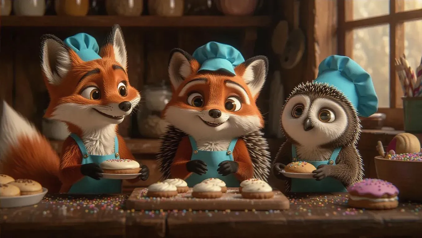 A whimsical bakery scene featuring a fox, hedgehog, and owl baking together. The fox expertly rolls out dough for pastries, the hedgehog checks ingredients, and the owl decorates cookies with jolly designs. Vintage oak tables, colorful sprinkles, and whimsical baker's caps. Cheerful atmosphere with playful details like a cookie perched on a shelf and the owl sneaking a nibble. Animals express joy and concentration