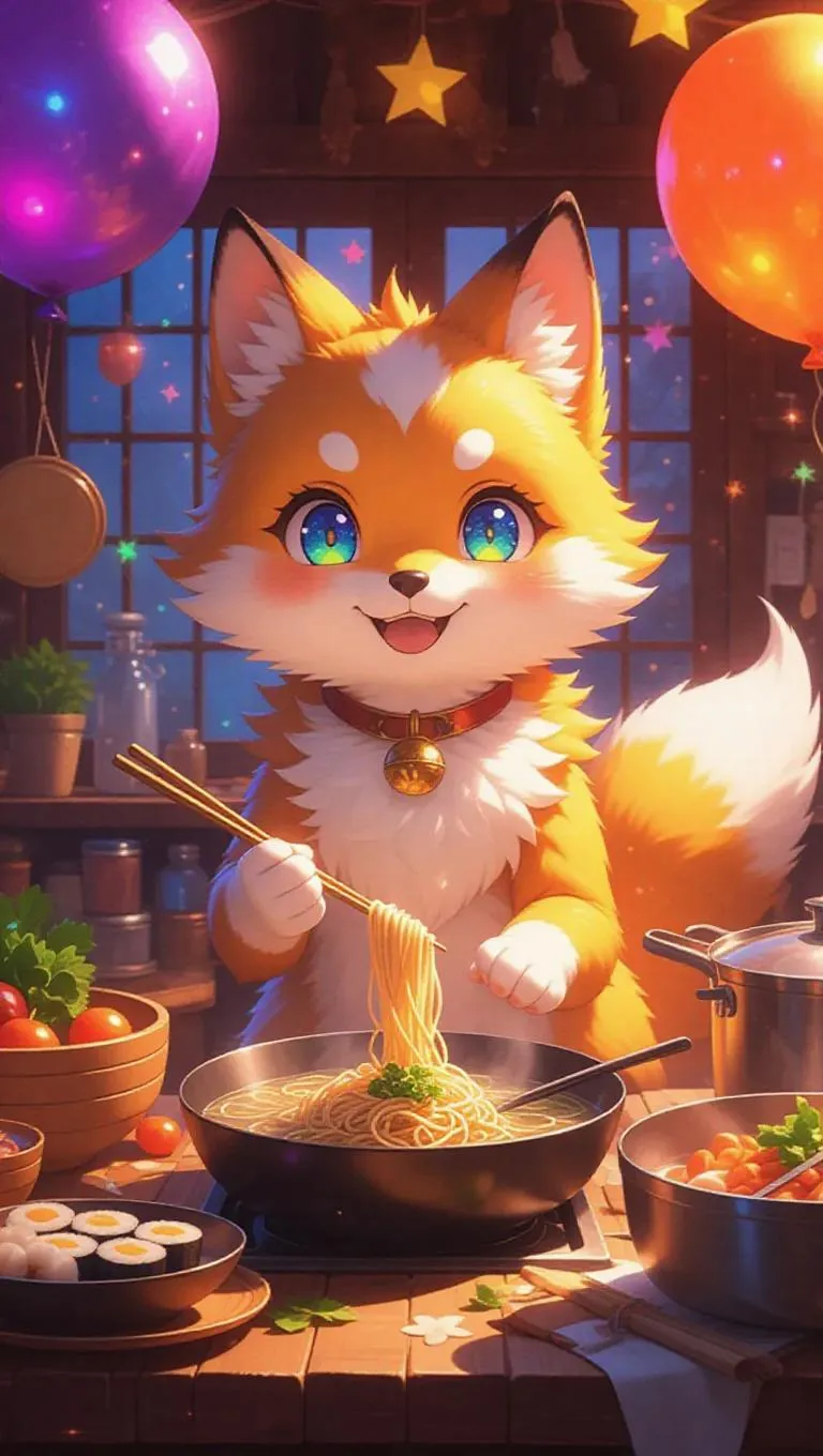 A lively little kitsune with a sunny yellow and white coat, bright twinkling eyes, found in a cheerful harvest fair kitchen. Making ramen and sushi, surrounded by fresh produce, colorful balloons, boiling pots, and twinkling stars, creating a festive and joyful atmosphere.