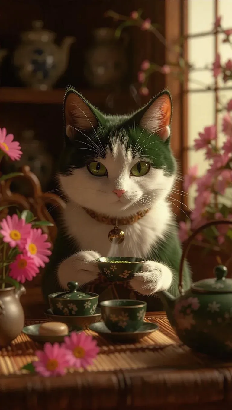A clever little kitsune with an earthy green and cream coat, sly glimmering eyes, found in a traditional tea ceremony setup. Preparing matcha and wagashi, surrounded by elegant ceramics, vibrant flowers, steaming tea kettles, and soft sunlight, creating a peaceful and meditative ambiance.