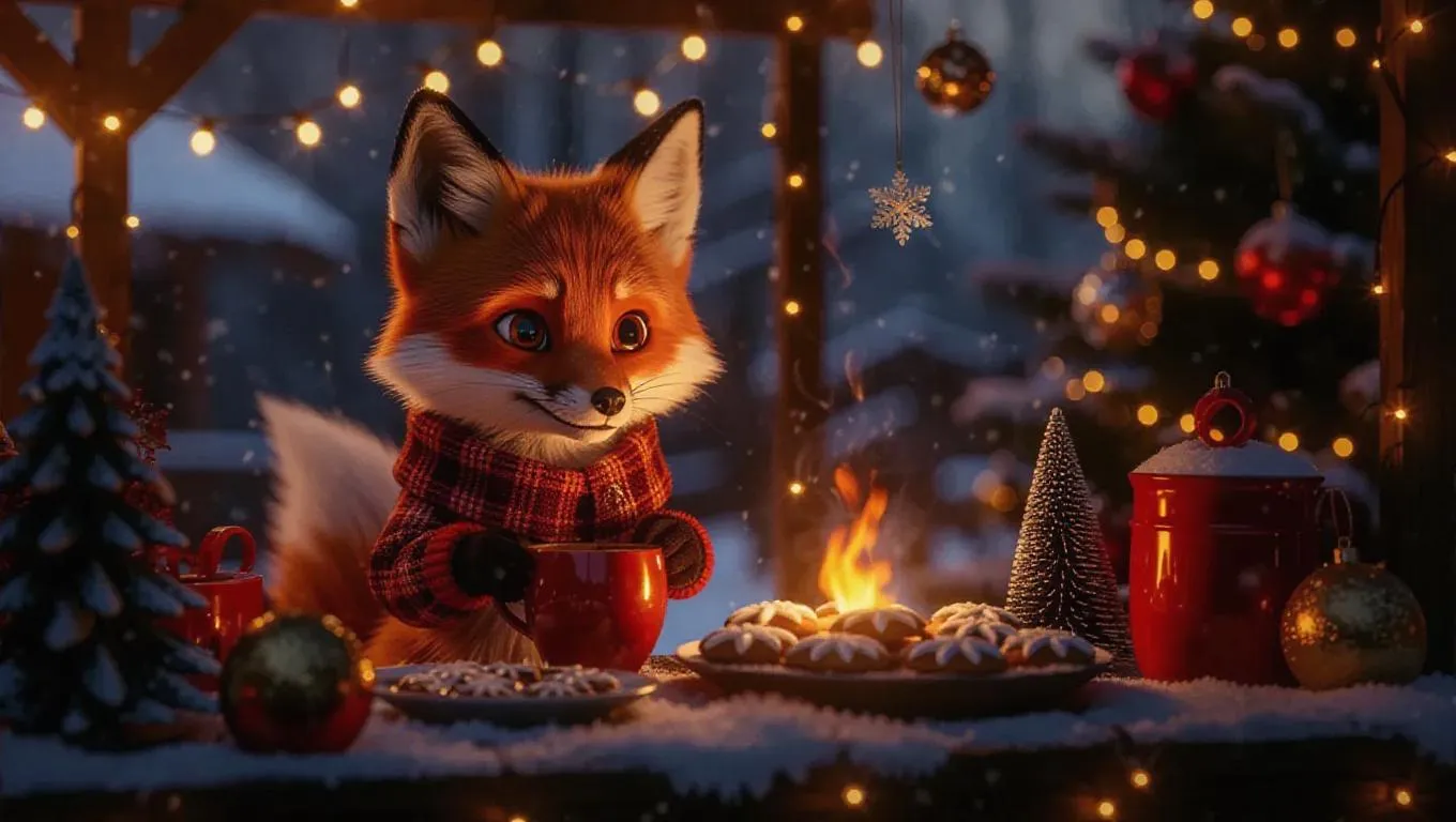 A bold little kitsune with a fiery red and black coat, sharp cunning eyes, found in a winter holiday market stall. Creating hot chocolate and gingerbread cookies, surrounded by twinkling lights, snowflakes, crackling fires, and festive ornaments, creating a warm and cozy atmosphere.