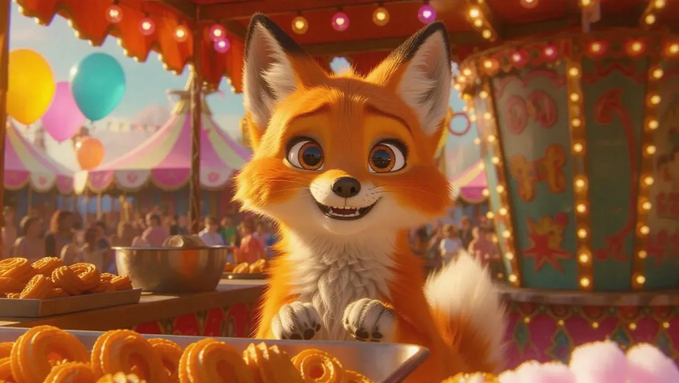A jolly little kitsune with a bright orange and cream coat, cheerful glimmering eyes, found in a festive carnival food booth. Frying churros and cotton candy, surrounded by lively rides, colorful balloons, sizzling fryers, and laughter, creating a joyful and exuberant atmosphere.