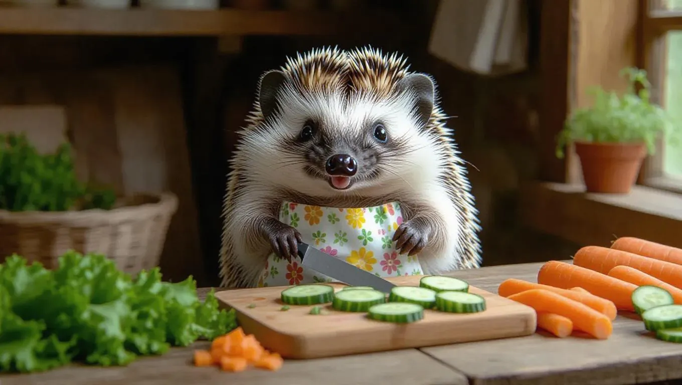 A delighted hedgehog, wearing a cute floral apron, is preparing vegetable rolls in a quaint, country kitchen. Using a knife, the hedgehog chops fresh ingredients, with items like cucumbers, carrots, and lettuce on the counter. After finishing, the hedgehog sits at a rustic wooden table, curling up happily while savoring the rolls.