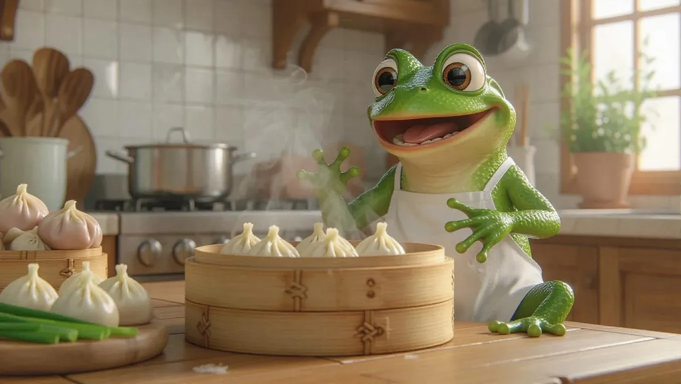 A cheerful frog, wearing a simplistic white apron, is steaming dumplings in a tidy, Asian-style kitchen. Using a steaming basket, the frog checks on the dumplings, with fresh ingredients like dough, pork, and scallions prepared on the counter. After finishing, the frog sits at a bamboo table, croaking joyfully while enjoying the dumplings.
