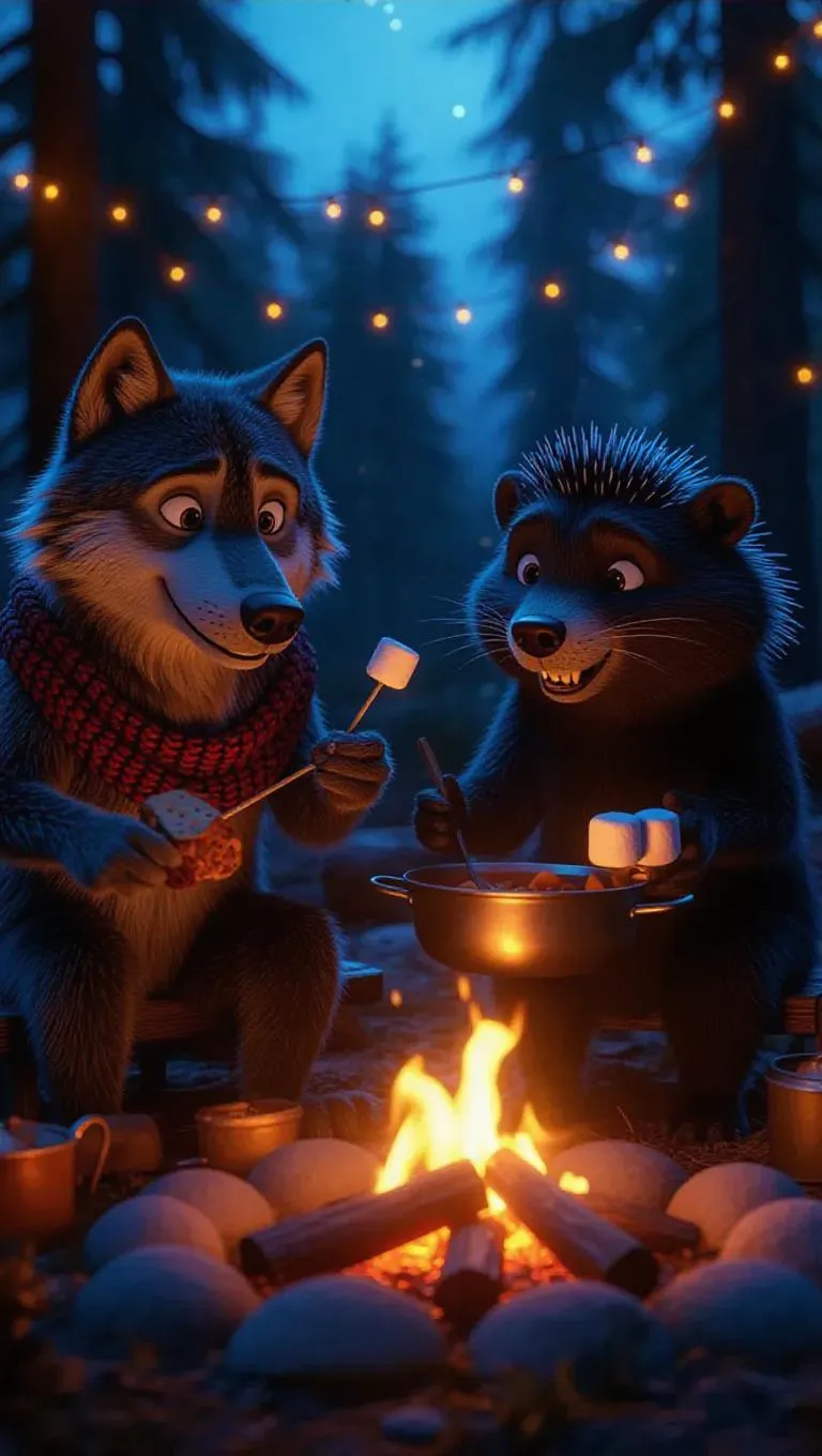 A cozy campfire scene featuring a wolf, beaver, and porcupine cooking together. The wolf stirs a pot of hearty stew, the beaver slices bread with care, and the porcupine roasts marshmallows on sticks. Log seats, rustic cooking tools, and knitted scarves. Warm, glowing atmosphere with funny moments like a marshmallow stuck to the wolf’s nose and the porcupine sneaking a bite of bread. Animals exude warmth and concentration, surrounded by a starlit sky and crackling flames.