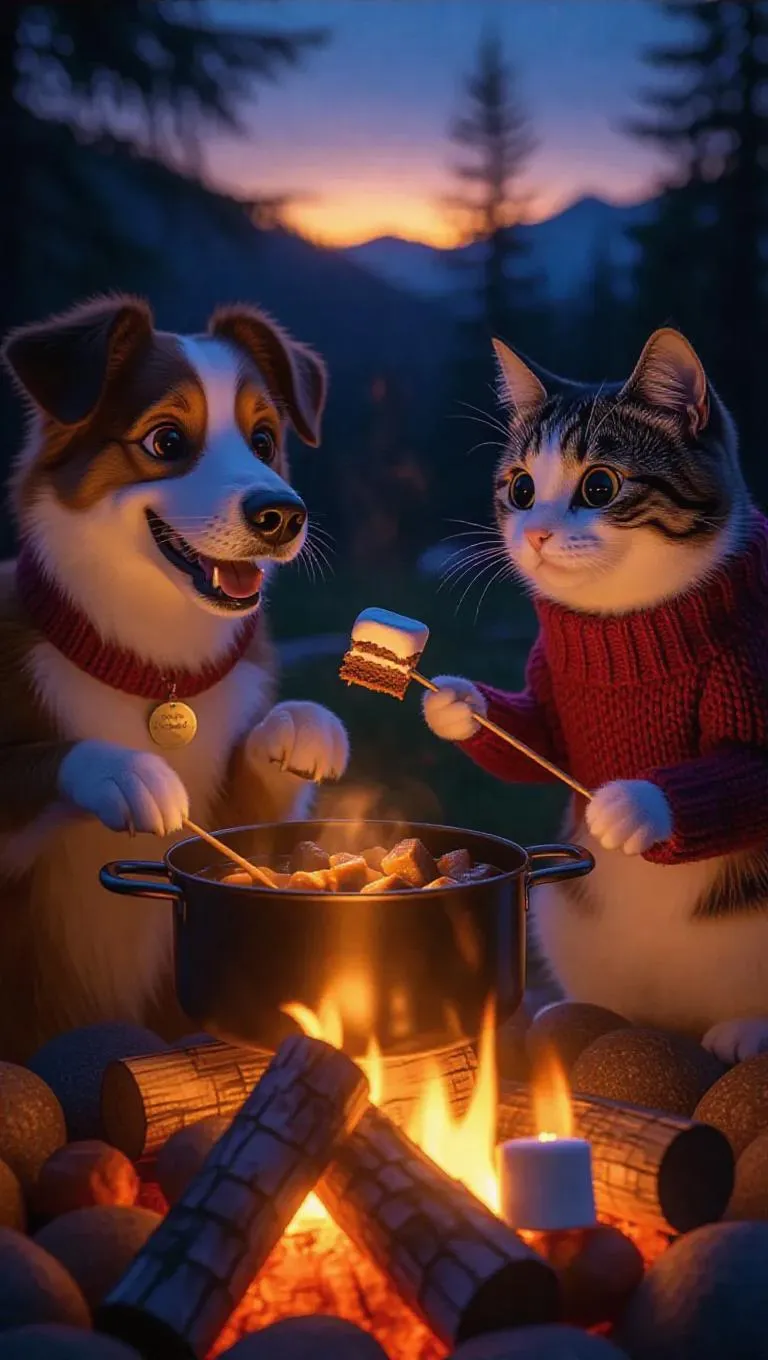 A cozy campfire scene featuring a dog, cat, and hamster cooking together. The dog stirs a pot of beef stew, the cat slices cake with care, and the hamster roasts marshmallows on sticks. Log seats, comfortable cooking tools, and cozy sweaters. Warm, glowing atmosphere with funny moments like a marshmallow catching fire and the hamster sneaking a bite of cake. Animals exude warmth and concentration, surrounded by a twilight sky and crackling flames.