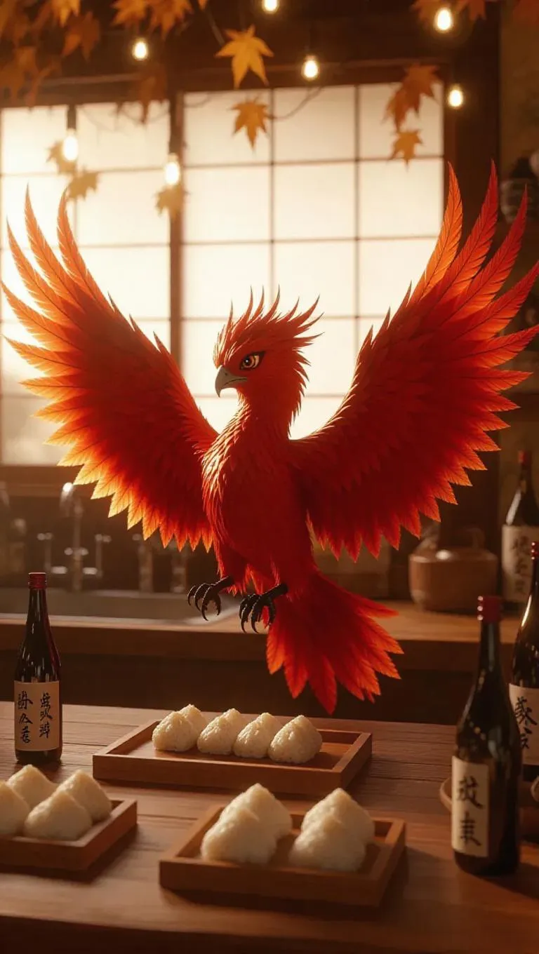 The curious little phoenix with fiery red and gold feathers and piercing amber eyes flutters its wings gently, creating a soft breeze that causes the string lights to sway. It rolls temaki and shapes onigiri with delicate precision, its movements graceful and fluid. The camera pans slowly from the phoenix’s wings to the traditional and modern elements of the cozy kitchen, including wooden trays, sake bottles, and drifting golden leaves, capturing the harmonious blend of the mystical and the mundane