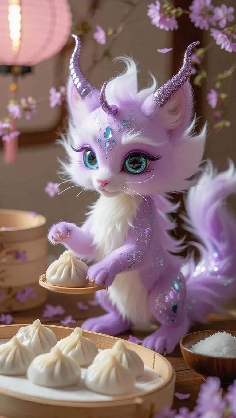The whimsical little qilin with pastel purple and silver fur and shining teal eyes flutters its mane delicately, creating a soft draft that makes the paper lanterns sway. It crafts baozi and shapes nigiri with precise movements, its gestures smooth and elegant. The camera shifts softly from the qilin's mane to the elegant and avant-garde aspects of the cozy kitchen, showcasing bamboo steamers, spices, and drifting lavender petals, illustrating the stunning balance of the mythical and the routine.