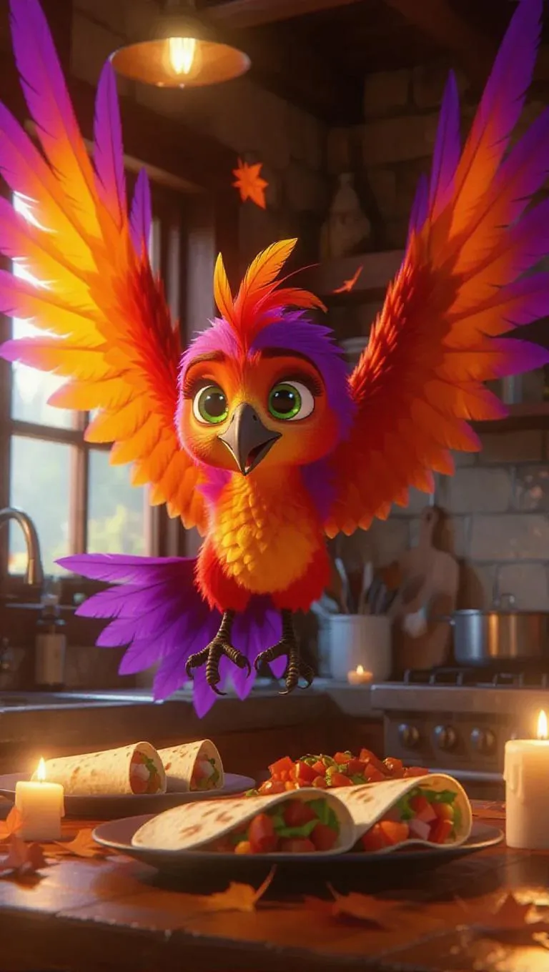 The vibrant little harpy with fiery orange and purple feathers and lively green eyes flutters its wings energetically, producing a warm breeze that makes the candles flicker. It rolls burritos and assembles tacos with agile precision, its movements swift and coordinated. The camera pans sideways from the harpy’s wings to the hip and homey aspects of the inviting kitchen, including slate platters, craft beer, and tumbling russet leaves, showcasing the lively mix of the spirited and the everyday.