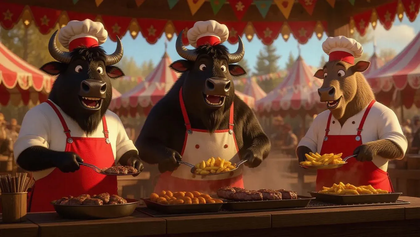 A carnival food stall scene featuring a buffalo, bison, and antelope cooking together. The buffalo grills steaks with a hearty laugh, the bison fries potato wedges with powerful flips, and the antelope assembles salads with grace. Brightly decorated stalls, prairie colors, and wild west-themed chef hats. Festive, lively atmosphere with humorous touches like wedges flying onto the buffalo's back and the antelope copying the steak cutting. Animals exude strength and vitality.