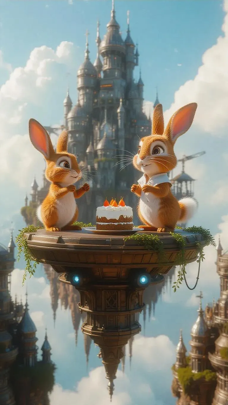 In a floating sky city, a tech-savvy rabbit named Quantum crosses paths with an orange rabbit chef, Carrot, struggling with her carrot cake. Quantum offers to help, using quantum computing to refine the texture and flavor. Carrot, initially doubtful, soon realizes Quantum’s precision and her passion create the most decadent cake in the skies. Together, they blend cutting-edge technology and classic techniques, becoming celebrated for their ultimate dessert.