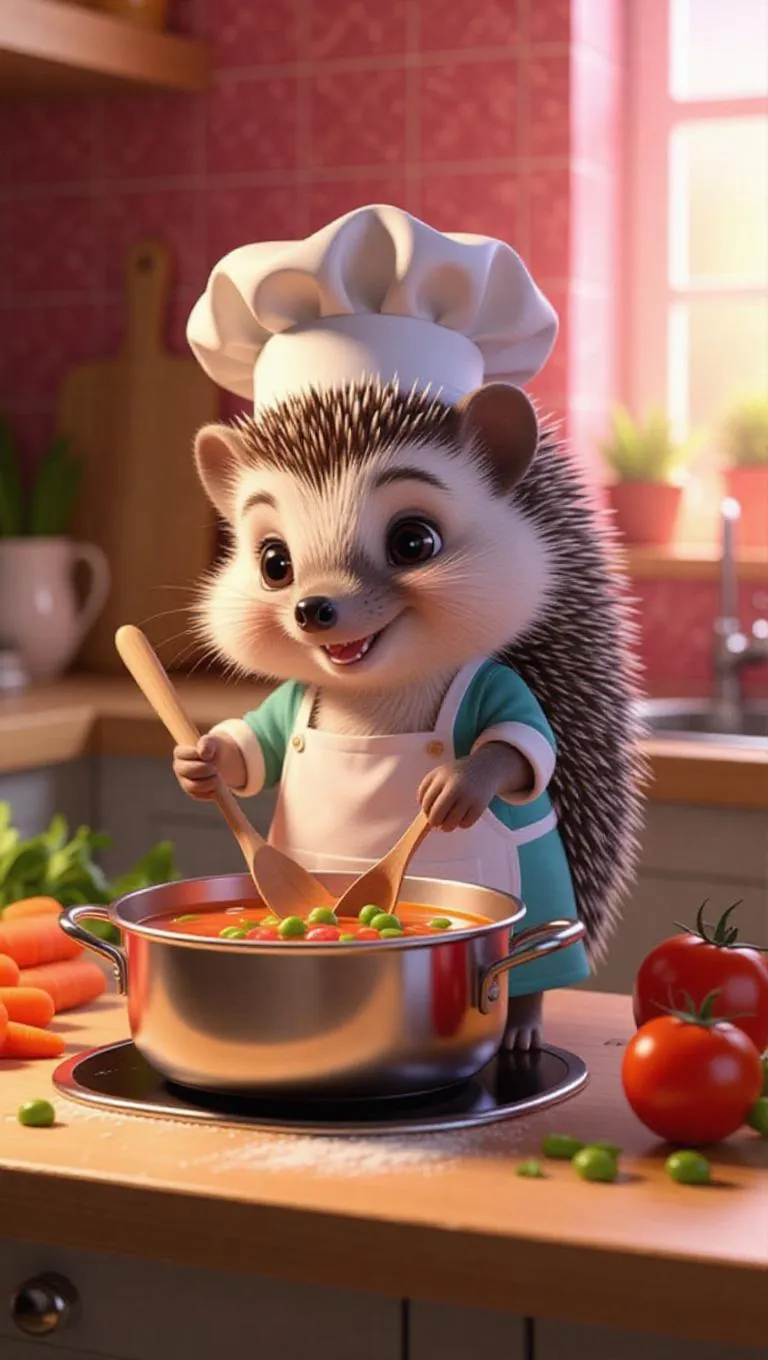 A charming cartoon hedgehog in a tiny chef's hat and apron, standing on a cozy kitchen counter. The hedgehog is diligently stirring a pot of vibrant, colorful soup with a wooden spoon, surrounded by fresh vegetables like carrots and tomatoes. Soft pink light bathes the scene, creating a warm and inviting atmosphere. The hedgehog looks focused and joyful, with a sprinkle of flour on its nose.