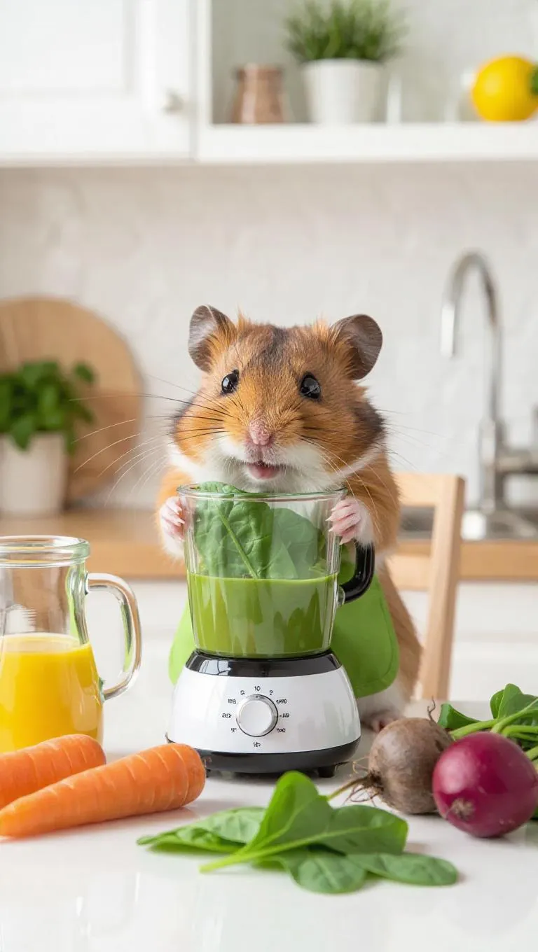 A playful hamster is blending a vegetable smoothie in a bright, minimalist kitchen. The hamster is wearing a tiny apron and using a blender to mix fresh vegetables like spinach, carrots, and beets. On the counter, there are additional vegetables and a jug of lemon juice. After finishing the smoothie, the hamster sits on a chair with a glass of smoothie in front of it, sipping joyfully.