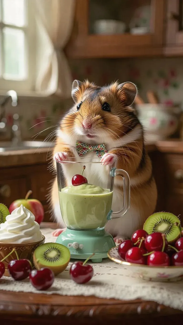 A clever hamster is crafting a dessert smoothie in a vintage, charming kitchen. The hamster is wearing a tiny bow tie and using a blender to mix fresh fruits like cherries, kiwis, and pears. On the counter, there are additional fruits and a bowl of whipped cream. After finishing the smoothie, the hamster sits on a cushion with a glass of smoothie in front of it, sipping indulgently.