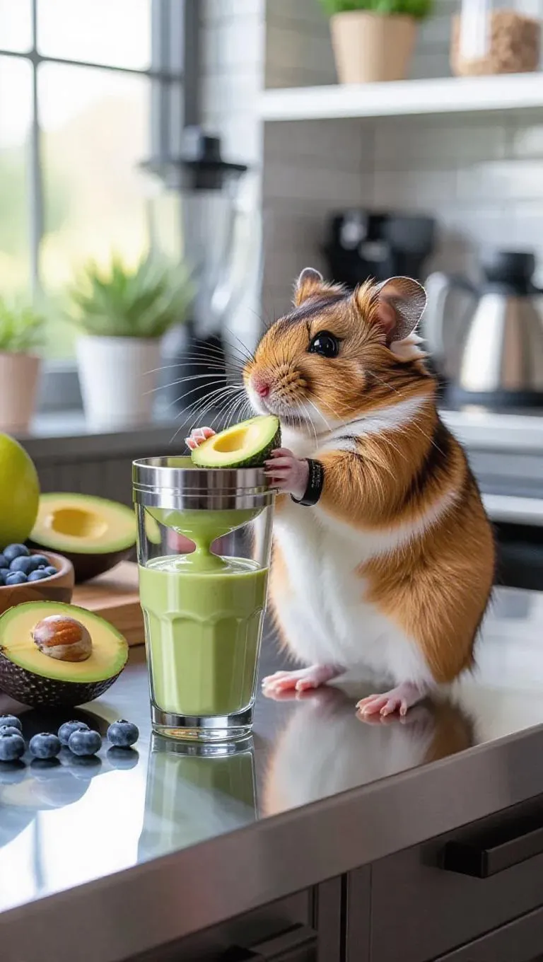 A creative hamster is concocting a protein smoothie in a sleek, industrial kitchen. The hamster is wearing a tiny wristband and using a blender to mix fresh fruits like blueberries, avocados, and protein powder. On the counter, there are additional fruits and a scoop of peanut butter. After finishing the smoothie, the hamster sits on a bar chair with a glass of smoothie in front of it, sipping proudly.
