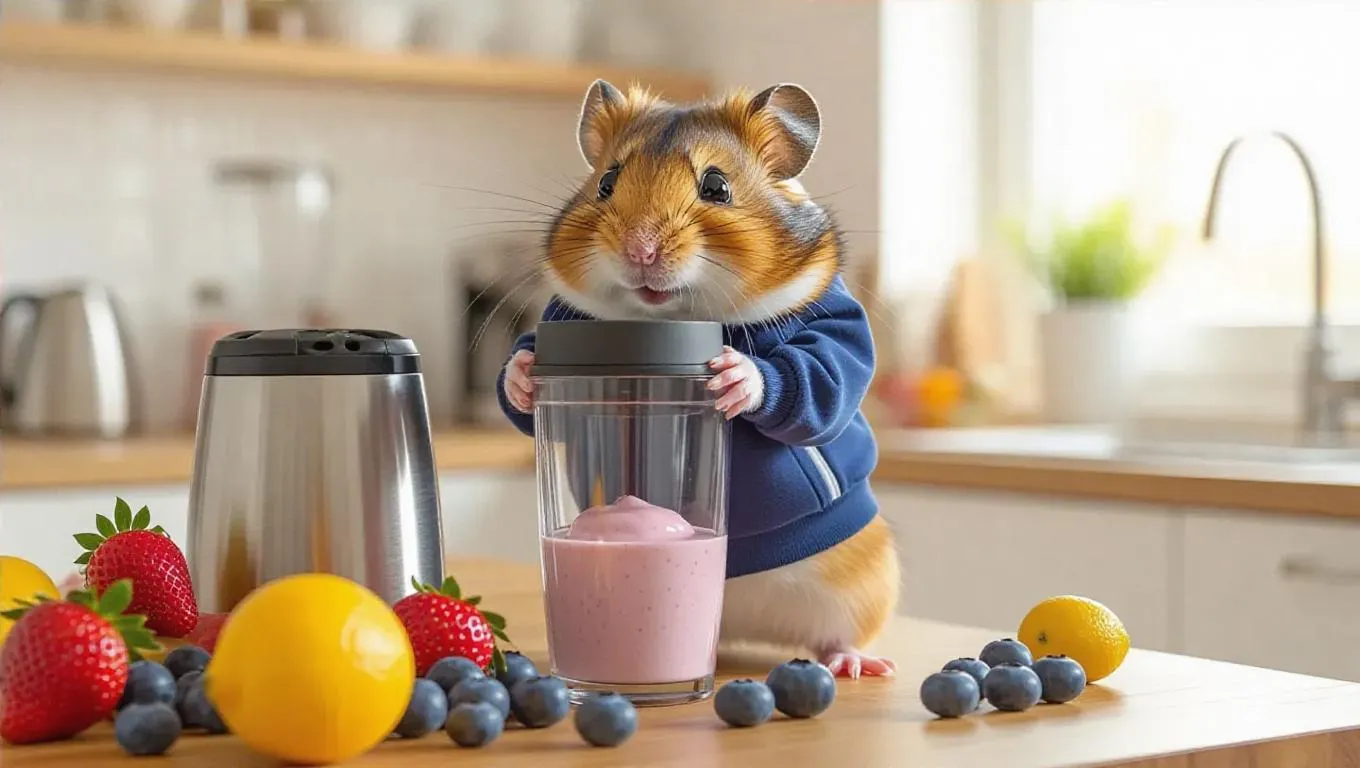 An energetic hamster is whipping up a sports smoothie in a bright, athletic kitchen. The hamster is wearing a tiny tracksuit and using a blender to mix fresh fruits like strawberries, blueberries, and yogurt. On the counter, there are additional fruits and a container of protein powder. After finishing the smoothie, the hamster sits on an exercise ball with a glass of smoothie in front of it, sipping energizingly.