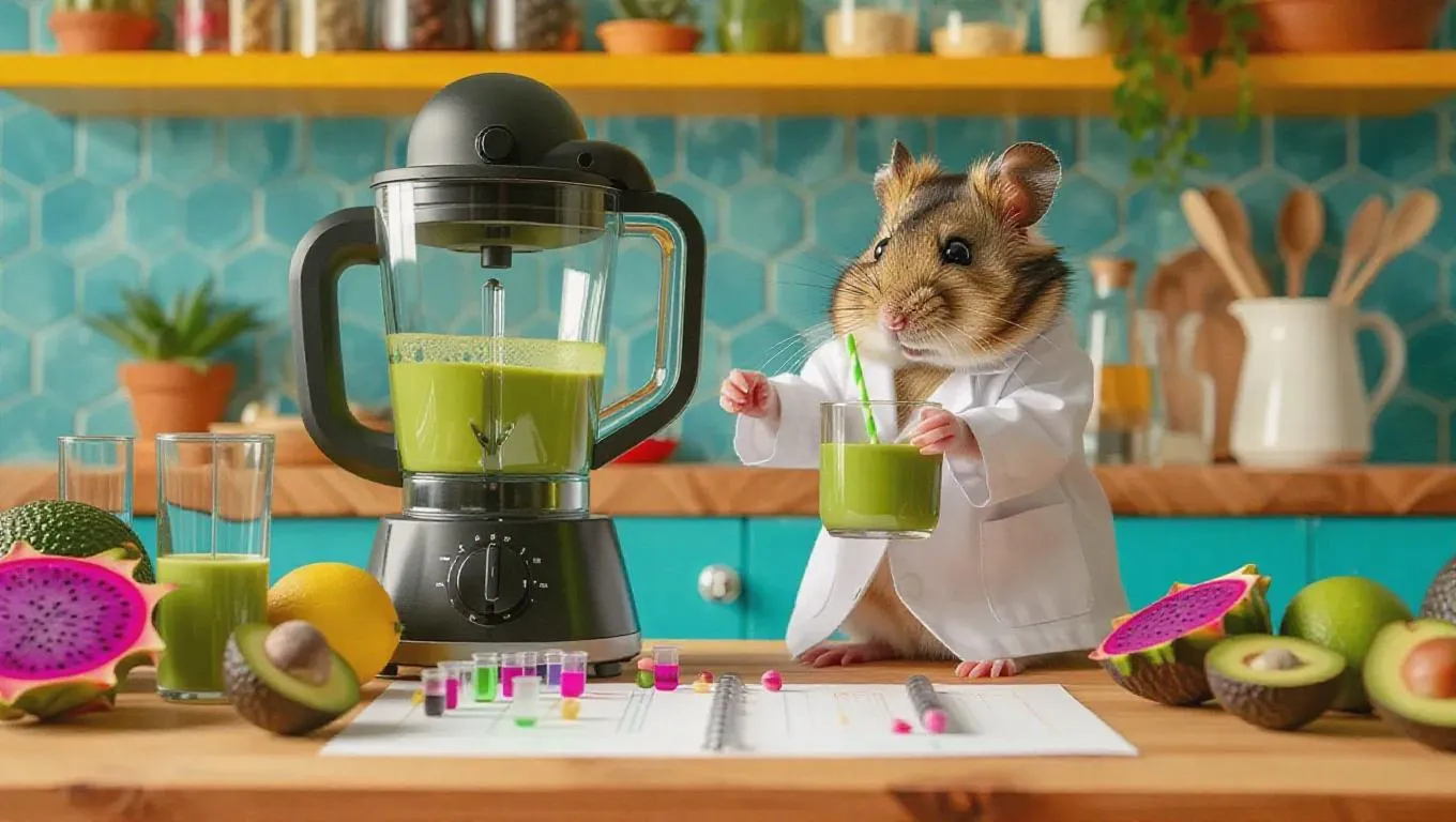 A daring hamster is preparing an experimental smoothie in a vibrant, creative kitchen. The hamster is wearing a tiny lab coat and using a blender to mix fresh fruits like dragon fruit, avocado, and matcha powder. On the counter, there are additional fruits and a set of test tubes. After finishing the smoothie, the hamster sits at a drafting table with a glass of smoothie in front of it, sipping innovatively.