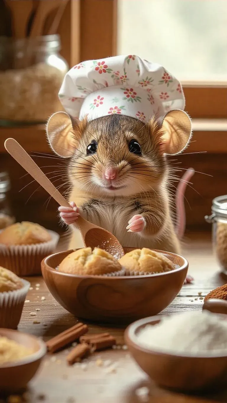 A tiny mouse, donning a floral chef’s hat, happily bakes muffins in an inviting, cottage kitchen. Using a wooden spoon, the mouse stirs batter in a bowl, surrounded by ingredients like coconut sugar, almonds, and fragrant cinnamon. After baking, the mouse curls up in a sunny nook, savoring a muffin, its tail twitching contentedly.