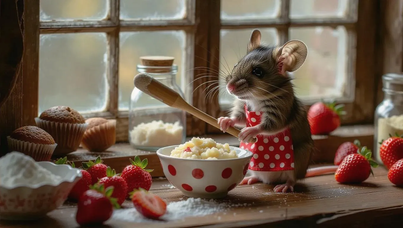 A tiny mouse, adorned with a polka-dot apron, diligently bakes muffins in a rustic, countryside kitchen. Using a spatula, the mouse gently mixes batter in a bowl, surrounded by ingredients like cane sugar, strawberries, and ground almonds. After baking, the mouse sits by a window, relishing a muffin, its eyes sparkling.