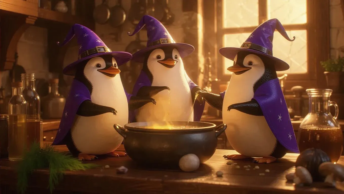 Ultra-realistic penguins in a fantasy kitchen, each wearing a whimsical wizard hat and robe, magically concocting a gourmet potion soup. Surrounded by glowing ingredients and bubbling cauldrons, they work with wonder. Fresh ingredients like enchanted herbs, mystical mushrooms, and crystal clear broth are artfully arranged on the counter, capturing the essence of culinary magic and enchanting charm.
