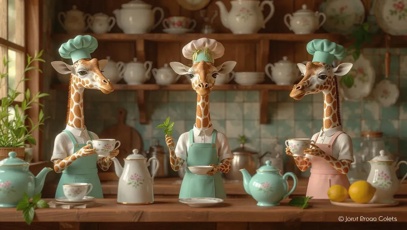 Ultra-realistic giraffes in a cozy tea house kitchen, each adorned with a pastel chef’s hat and apron, meticulously preparing herbal tea. Traditional appliances like a kettle and delicate teapots add to the charm. Fresh ingredients like chamomile, mint, and lemon are neatly arranged on the wooden shelf. The scene exudes culinary artistry and anthropomorphic elegance, with the giraffes’ graceful and deliberate movements.