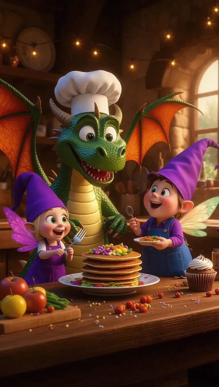A whimsical kitchen scene featuring a dragon, fairy, and gnome cooking together. The dragon skillfully flips pancakes, the fairy chops vegetables with agility, and the gnome frosts cupcakes. Rustic wooden counters, colorful ingredients, and adorable chef hats. Bright, playful atmosphere with humorous touches like a pancake on the ceiling and the gnome sneaking a bite. Characters show excitement and concentration, surrounded by a sprinkle of fairy lights and a cozy, warm glow.
