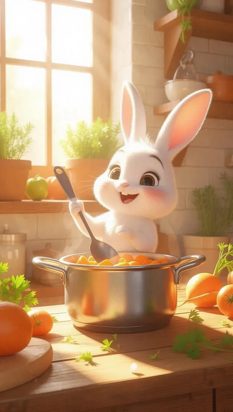 A playful cartoon fluffy rabbit stands beside a simmering pot, using a big spoon to stir the carrot stew, with a joyful expression and a scatter of carrot greens around, creating a cheerful and inviting kitchen atmosphere, wooden shelves stacked with vegetables and fruits, sunlight pouring through the window, adding a warm ambiance