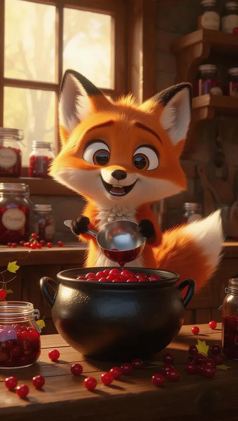 A delightful cartoon fluffy fox stands beside a bubbling cauldron, using a silver ladle to stir the berry brew, with a curious expression and a sprinkle of berry leaves around, creating a vibrant and inviting kitchen atmosphere, wooden shelves adorned with jars of jam, sunlight beaming through the window, adding a bright cheerfulness