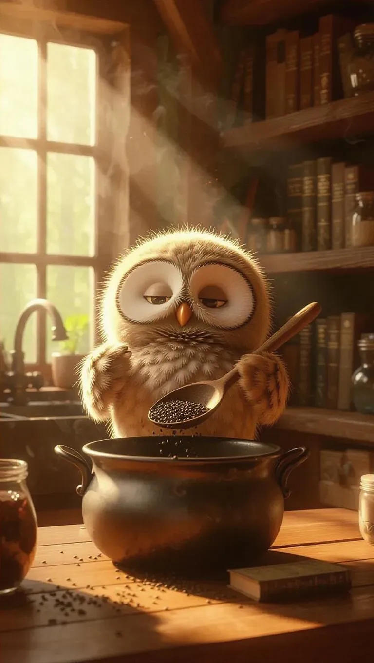 An adorable cartoon fluffy owl perches beside a bubbling pot, using a wooden spoon to stir the herbal tea, with a sleepy expression and a scattering of tea leaves around, creating a tranquil and inviting kitchen atmosphere, wooden shelves brimming with books and potions, sunlight streaming through the window, adding a soft glow