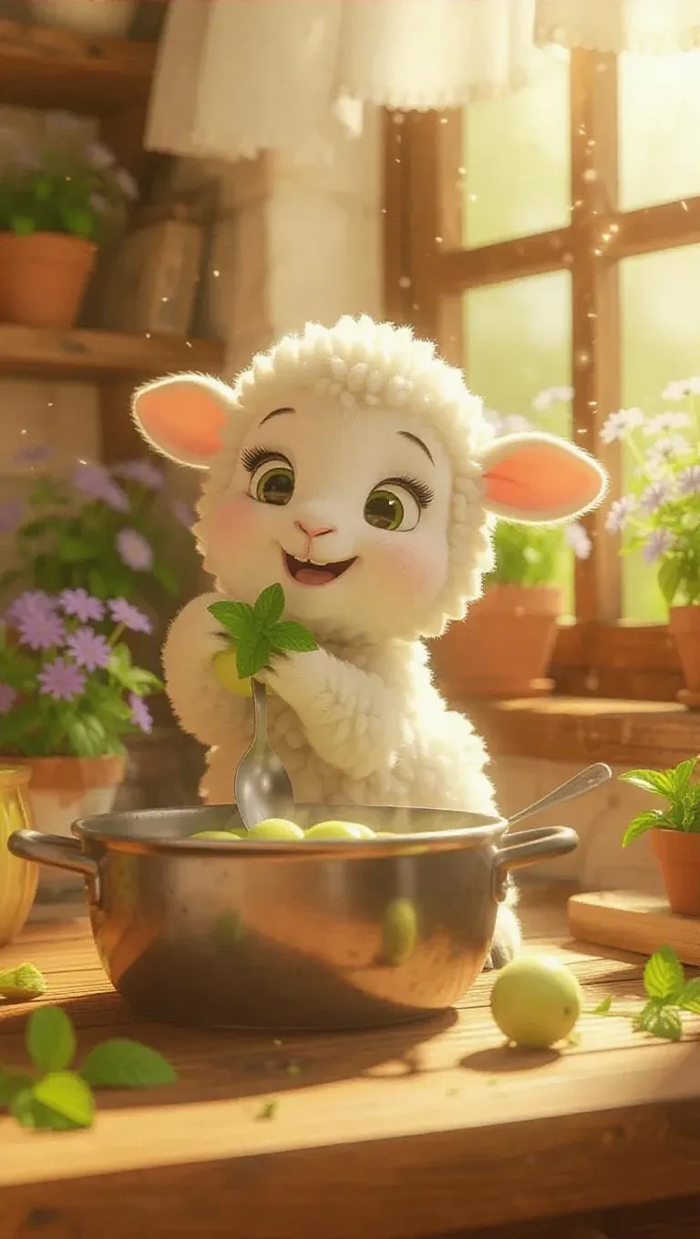 A sweet cartoon fluffy lamb prances beside a bubbling pot, using a melon baller to stir the minty soup, with a joyful expression and a flurry of mint leaves around, creating a fresh and inviting kitchen atmosphere, wooden shelves filled with flowers and herbs, sunlight streaming through the window, adding a lively tone