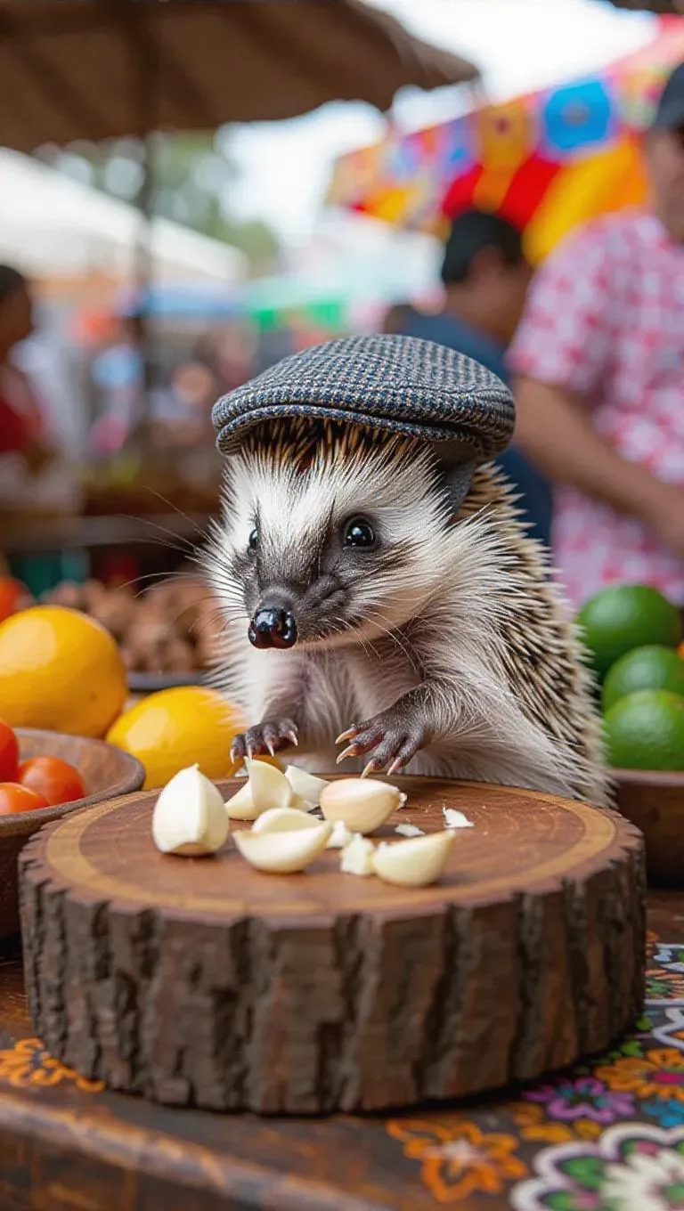 A meticulous hedgehog, wearing a newsboy cap, meticulously chops garlic on a rustic chopping block at an energetic South American street market. The hedgehog’s tiny claws slice with care, focused eyes on the task. Locals haggle for exotic fruits, artisans showcase vibrant crafts, and the air brims with the aroma of spicy street tacos. Colorful murals add vibrance to the eclectic atmosphere.