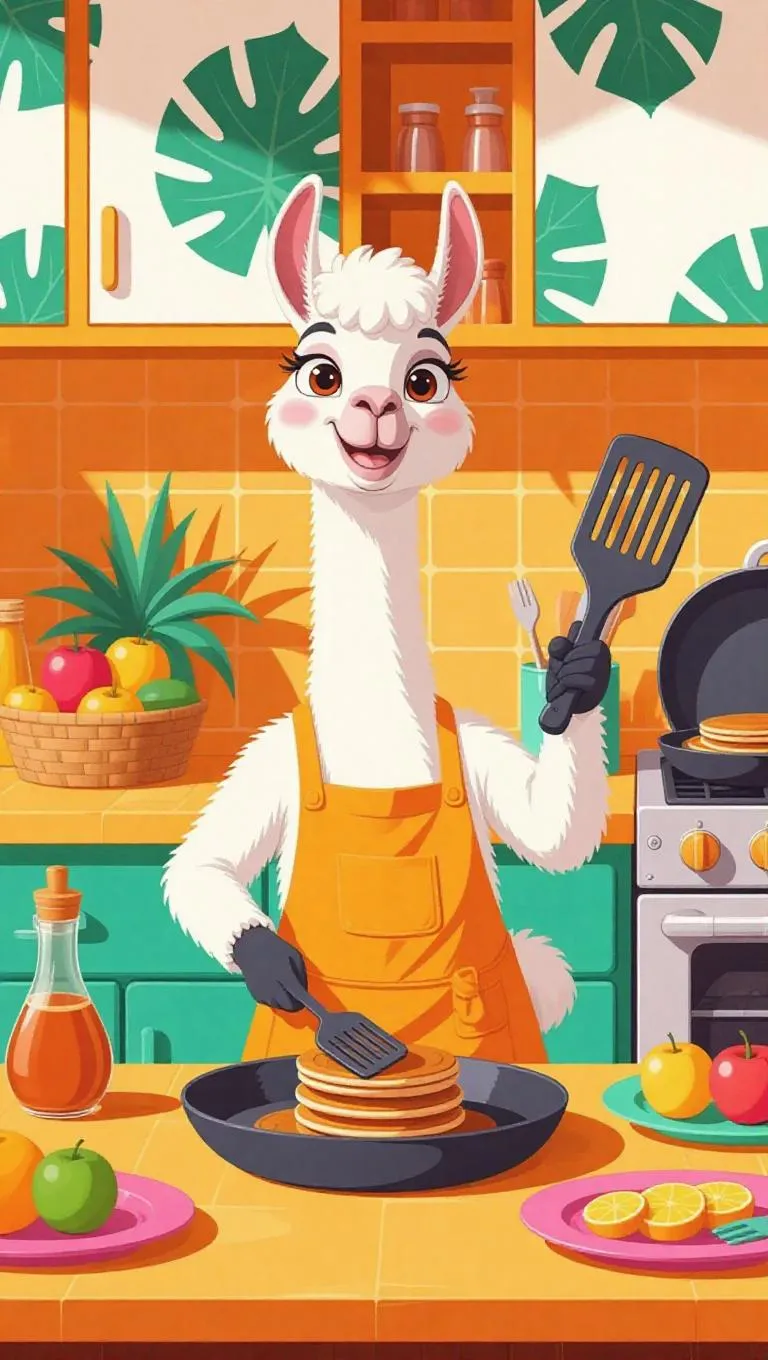 A spunky cartoon llama in a bright orange apron, whipping up pancakes in a sunny, tropical kitchen. The llama holds a frying spatula, flipping pancakes with a playful wink. The counter is filled with syrup, fruits, and colorful plates. The background showcases palm-patterned cabinets, a grill, and a tropical fruit basket. The llama’s long neck sways as it cooks.