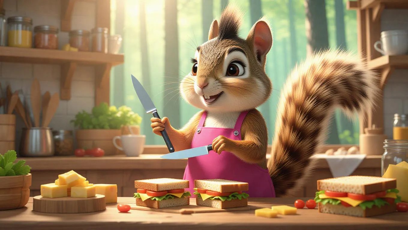 A jolly cartoon squirrel in a bright pink apron, assembling sandwiches in a forest kitchen. The squirrel holds a knife, layering ingredients with precision. The counter is piled with bread, cheese, and fresh veggies. The background features wooden shelves, a tree stump table, and picnic items. The squirrel’s fluffy tail twitches with excitement as it prepares.