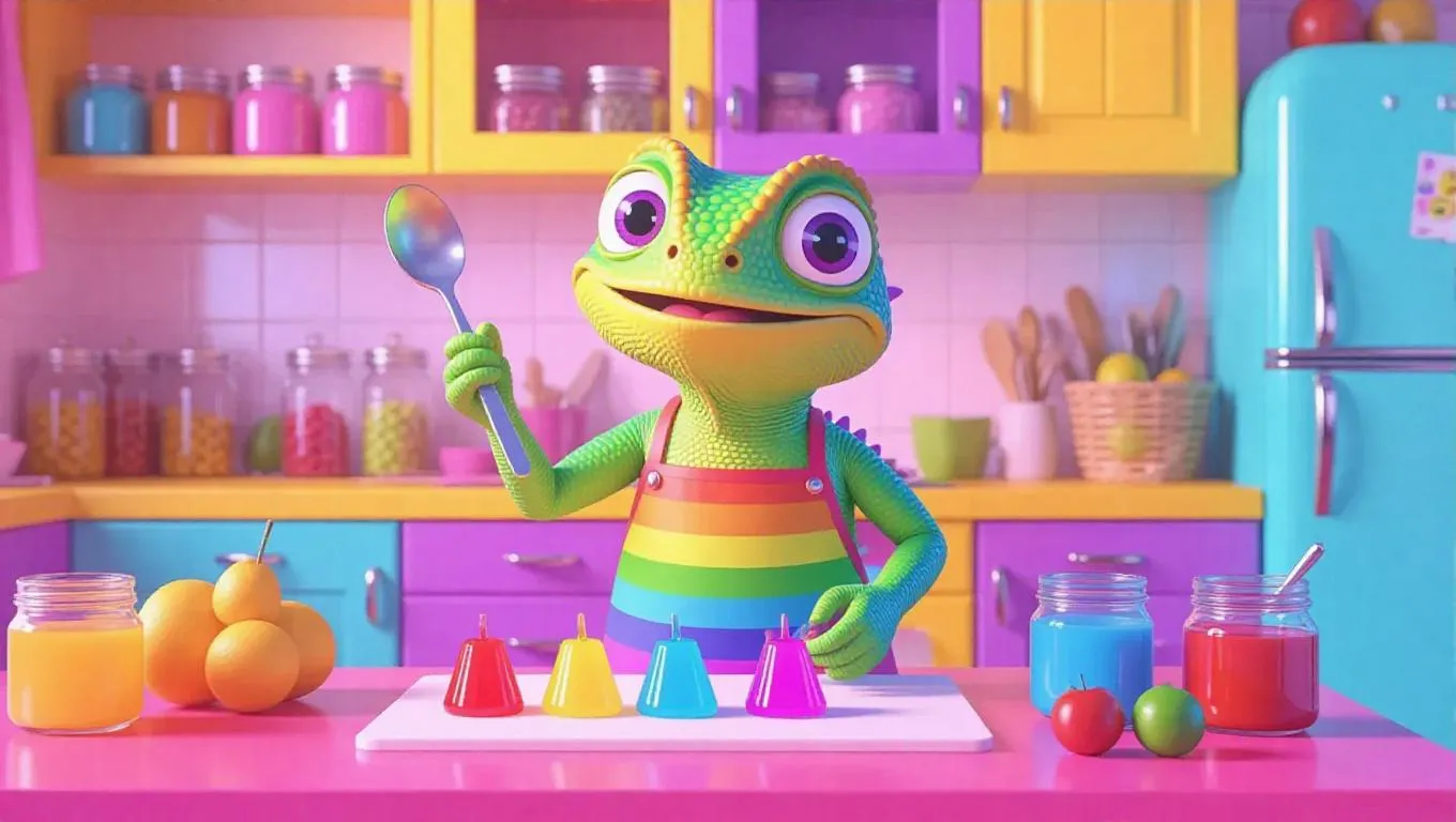 A playful cartoon chameleon in a rainbow apron, creating colorful jellies in a vibrant kitchen. The chameleon holds a spoon, stirring with curiosity. The counter is decorated with fruits, gelatin, and jars. The background showcases colorful cabinets, a glass fridge, and fruit baskets. The chameleon’s skin changes colors in delight as it cooks.