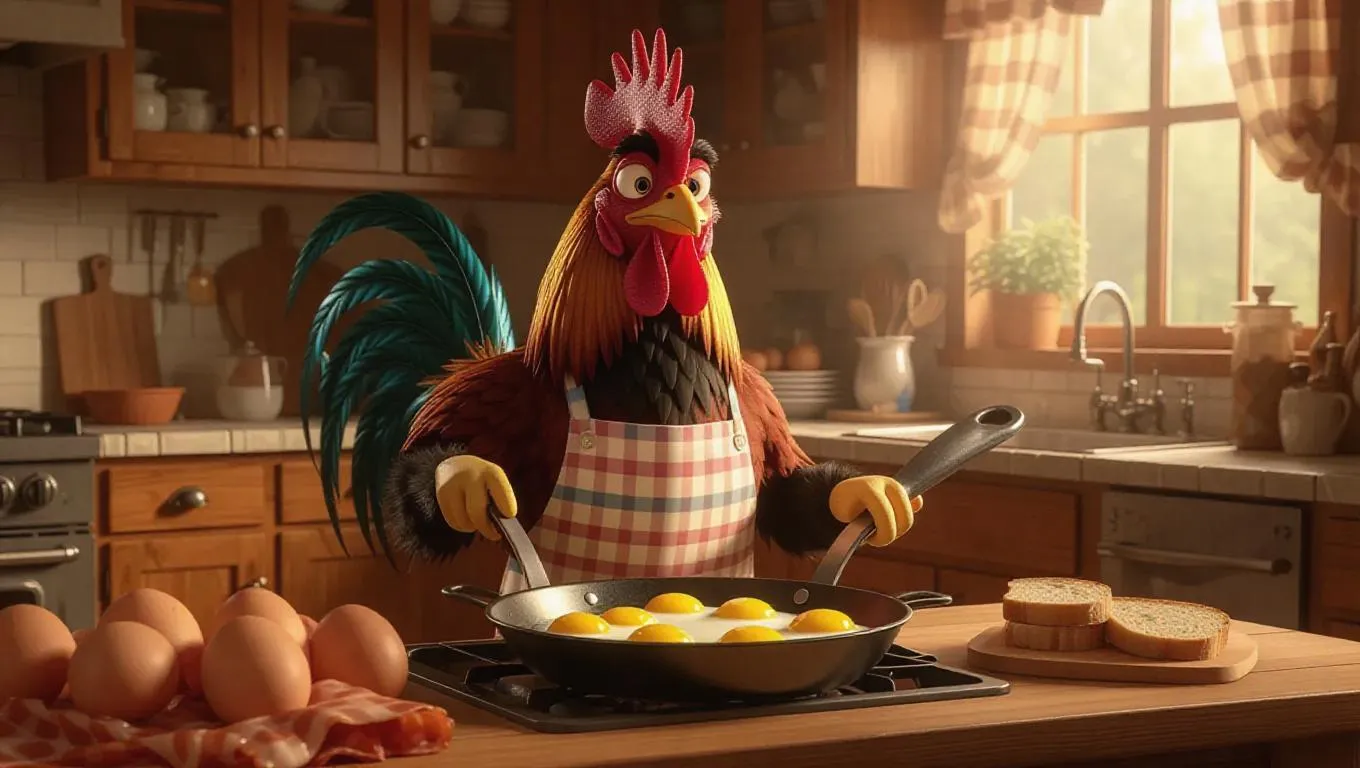 A dapper cartoon rooster in a plaid apron, making breakfast in a countryside kitchen. The rooster holds a frying pan, cooking eggs with precision. The counter is set with eggs, bacon, and toast. The background features wooden cabinets, a farmhouse table, and a comfy chair. The rooster’s colorful plumage shines in the morning light.