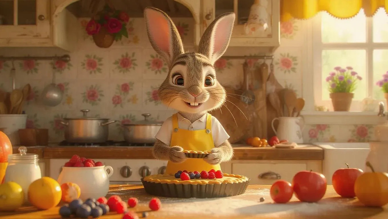 A whimsical cartoon rabbit in a bright yellow apron, crafting a fruit tart in a summer kitchen. The rabbit holds a tart pan, arranging fruits with care. The counter is covered with berries, cream, and pastry dough. The background showcases floral-patterned cabinets, a sunlit window, and seasonal decorations. The rabbit’s nose twitches in joy as it bakes.