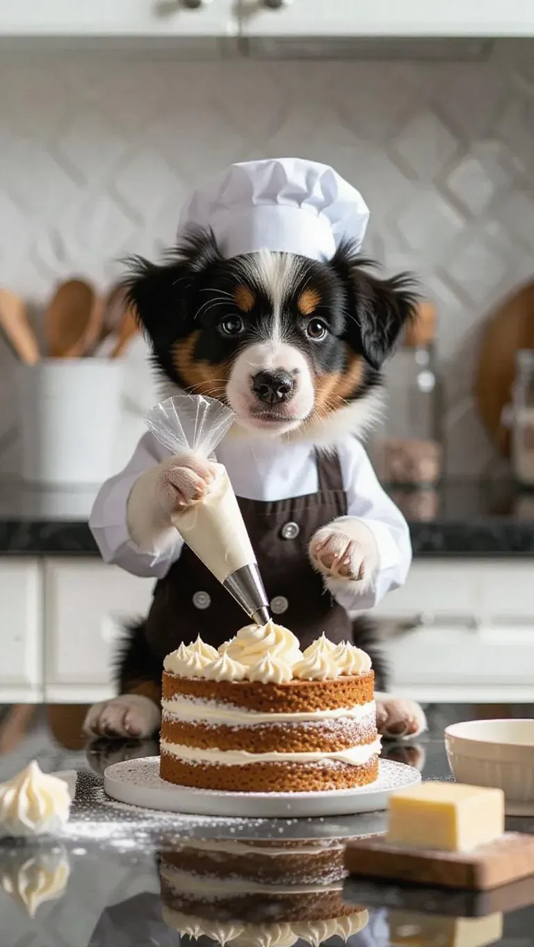 A mischievous puppy in a tiny chef’s apron is decorating a cake in a modern, sleek kitchen. Using a piping bag to apply frosting on a layered cake, surrounded by ingredients like butter, sugar, and food coloring. After finishing, the puppy sits on the kitchen floor, wagging its tail, gazing at the beautifully decorated cake.