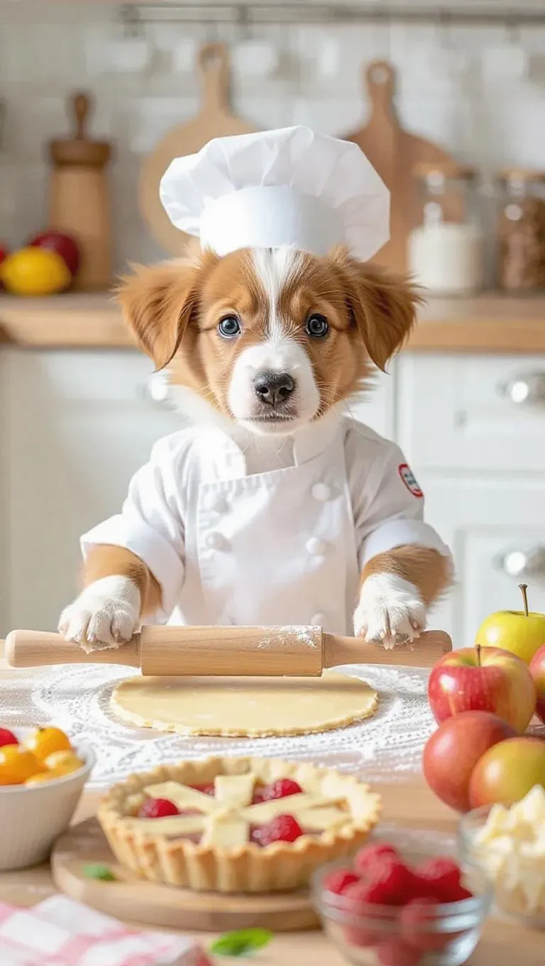A playful puppy in a tiny chef’s outfit is rolling out pie crust in a bright, airy kitchen. Using a rolling pin to flatten dough on a countertop, surrounded by ingredients like fruit filling, sugar, and spices. After finishing, the puppy sits nearby, enjoying a slice of freshly baked pie.
